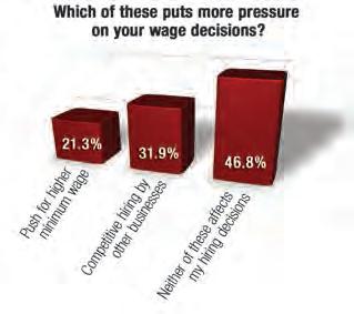 For the majority of respondents (46.8%), neither of these affects their wage decisions. Roughly 31.9% are pressured more by competitive hiring by other businesses. The remaining 21.3% of respondents say they feel the most pressure from the push for a higher minimum wage.