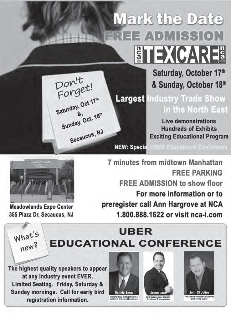National Cleaners Association. TexCare 2015, to be held Oct. 16-18 in Secaucus, N.J. Call 800-888-1622.