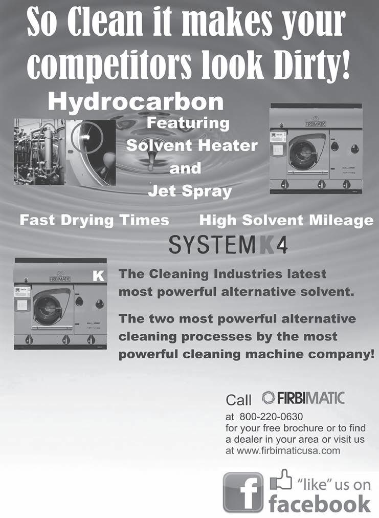 BUSINESS OPPORTUNITIES COMPUTER SYSTEMS CHEMICALS ENHANCE YOUR WET-CLEANING SMARTCare Detergent, Conditioner & Sizing Nature-L In-The-Wash Grease & Oil Remover EnLIGHTen Removes Stains Sodium Perborate Can’t KLEERWITE CHEMICAL www.kleerwite.com 877-553-3794 Own Your Own Drycleaners—Managers, Spotters, Tailors, Pressers! 100% Financing. Plant or Drop, location of your choice. Call 1-561-302-5031 or 1-888-275-6637. Established Dry Cleaning/Laundry Plant – Colorado Springs, Colorado, free stand ing building. Asking $155,000 and real estate available for lease or purchase. 1-800-530-2295 Dave Finsterwald NBB, Ltd. PARTS FOR SALE SELL OR BUY A DRYCLEANER. WE HAVE BUYERS!!! PATRIOT BUSINESS ADVISORS SPECIALIZES IN SELLING DRYCLEANERS IN NJ, PA, DE & MD. CALL LILIANE AT 267-391-7642. CONSULTING Western Wonder Touch POS Systems For Dry Cleaners $990 (refurb) + Free New Cash Drawer Commercial-grade touchscreens (not Dell) Perfect for small to medium cleaners www.westernDCcomputer.com 773-878-0150 westernk@msn.com www.AmericanDrycleaner.com PLANTS FOR SALE $ Million Sales Chains New on the Market For Sale • Coastal Carolina High Owner’s Profit $500,000 + Market area lacks Restoration • Suburban Chicago Plant Bldg. included in price • Growing Charlotte Plant Bldg. available to buy Exclusive Cleaner M&A Consultant: Richard Ehrenreich, CED Ehrenreich & Associates, LLC. 301-924-9247 Richard@Ehrenassoc.com