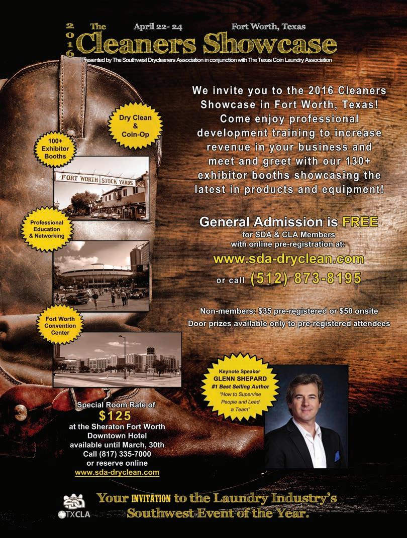 Southwest Drycleaners Association. Cleaners Showcase 2016, to be held April 2224 in Fort Worth, Texas. Call 512-873-8195.