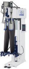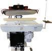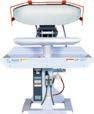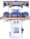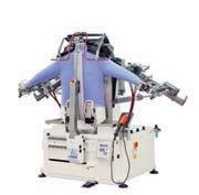 The Trevil machine operates like a tensioning pants topper. After that cycle is completed, instead of going to a legger press, the top mechanism raises up and a vacuum panel moves forward, he notes. The operator simply has to clip the pants in position to line up the creases and then push two buttons to close the vertical presses.