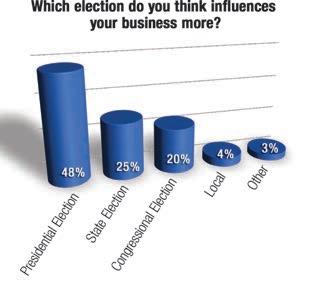 Which election do you think influences your business more? Respondents say presidential (48%), then state (25%), congressional (20%), local (4%) and “other” (3%). The polling question that received the most individual comments was this one: “Regardless of who is elected, what is the one issue that the next presidential administration must address immediately and why?” Some examples: