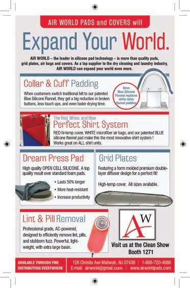 © Copyright AMERICAN TRADE MAGAZINES LLC, 2017. Printed in U.S.A. No part of this publication may be transmitted or reproduced in any form, electronic or mechanical, without written permission from the publisher or his representative. American Drycleaner does not endorse, recommend or guarantee any article, product, service or information found within. Opinions expressed are those of the writers and do not necessarily reflect the views of American Drycleaner or its staff. While precautions have been taken to ensure the accuracy of the magazine’s contents at time of publication, neither the editors, publishers nor its agents can accept responsibility for damages or injury which may arise therefrom.