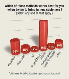 “Word of mouth” was the overwhelmingly clear winner, chosen by 80% of respondents, as the most successful method — of many methods — to bring in new customers. The graph on the right shows the full breakdown of methods, indicated by survey respondents (they could select any or all from the choices).