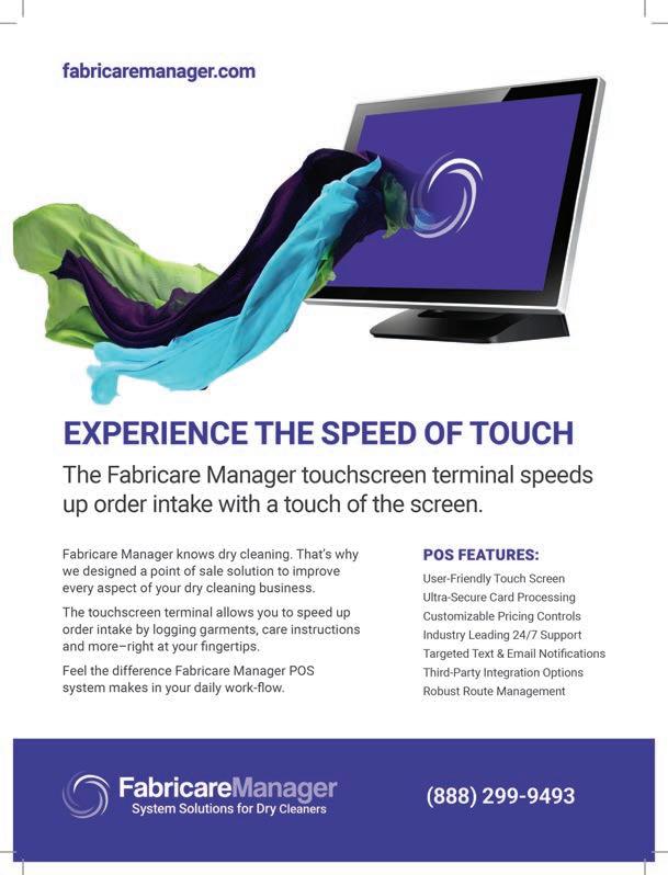 © Copyright AMERICAN TRADE MAGAZINES LLC, 2017. Printed in U.S.A. No part of this publication may be transmitted or reproduced in any form, electronic or mechanical, without written permission from the publisher or his representative. American Drycleaner does not endorse, recommend or guarantee any article, product, service or information found within. Opinions expressed are those of the writers and do not necessarily reflect the views of American Drycleaner or its staff. While precautions have been taken to ensure the accuracy of the magazine’s contents at time of publication, neither the editors, publishers nor its agents can accept responsibility for damages or injury which may arise therefrom.