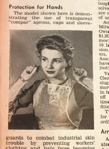 skin trouble by preventing workers’ clothing and hair from becoming saturated with oil and organic solvents. Drycleaners’ hands can also be protected by “compar” curvedfinger gloves. They are said to be tear-resistant, impervious to organic solvents, and to permit great freedom of hand movement. … Army Plant. A new drycleaning plant, operated by the Quartermaster Corps, U.S. Army Service Forces, opened at Camp Blanding, Fla., on January 3. When completely installed it was expected to handle the cleaning and pressing needs of 20,000 men per week, and thus, “relieve the over-worked civilian drycleaning plants of northern Florida.” ADC
