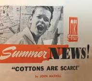 see photo, called Summer News!... Cotton is really king these days. We read of cotton dresses that cost $35, and designers are putting as much style into them as they used to put into silk. The conclusion seems obvious. The owners of these expensive, stylish dresses won’t want to entrust them to ordinary laundering methods. They may be perfectly safe, but knowing that cottons are scarce as well as expensive, their owners will probably prefer dry cleaning. If the cotton season had come in May, over-burdened cleaners might have said to laundries, “Take these cotton things and welcome to them!” But by July cleaners are likely to be looking for business again, and the peak of the cotton season fits right in with the slump in drycleaning volume.