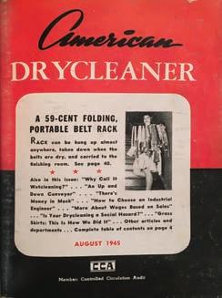 cover of the August 1945 issue of American Drycleaner: “Rack can be hung up almost anywhere, taken down when the belts are dry, and carried to the finishing room.” The feature continues inside the issue: “It can be unfolded in two sections, with about a half-dozen slender rods in each section, and the belts can be laid over these rods. When we say belts, we are, of course, speaking of the kind with composition backs. The plain cloth belts are simple enough to handle.” ADC