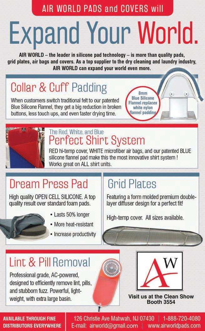 © Copyright AMERICAN TRADE MAGAZINES LLC, 2022. Printed in U.S.A. No part of this publication may be transmitted or reproduced in any form, electronic or mechanical, without written permission from the publisher or his representative. American Drycleaner does not endorse, recommend or guarantee any article, product, service or information found within. Opinions expressed are those of the writers and do not necessarily reflect the views of American Drycleaner or its staff. While precautions have been taken to ensure the accuracy of the magazine’s contents at time of publication, neither the editors, publishers nor its agents can accept responsibility for damages or injury which may arise therefrom.