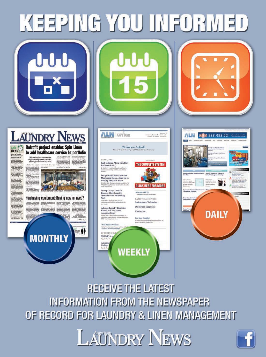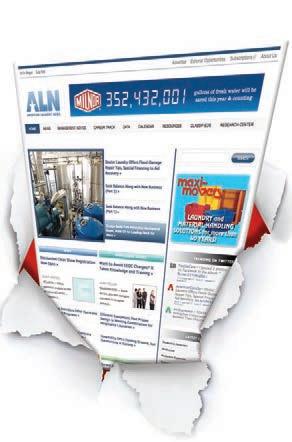 POSTMASTER, Send changes of address and form 3579 to American Laundry News Subscription Dept., 440 Quadrangle Drive, Suite E, Bolingbrook, IL 60440. Volume 39, number 6. Editorial, executive and advertising offices are at 566 West Lake Street, Suite 420, Chicago, IL 60661. Charles Thompson, President and Publisher. American Laundry News is distributed selectively to qualified laundry and linen management and distributors in the United States. No material appearing in American Laundry News may be reprinted without written permission. The publisher reserves the right to reject any advertising for any reason.