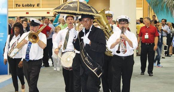 After the ceremonial ribbon is cut, a band marches attendees onto the exhibit floor. Below, people line up in the convention center lobby as they wait to register on the Clean Show’s opening morning. (Photos: Bruce Beggs)