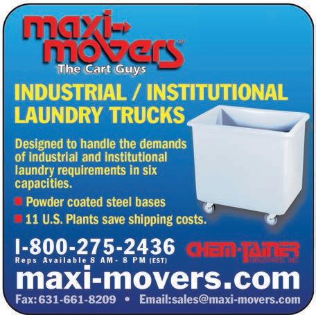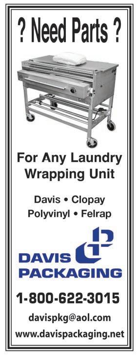 HEAT SEALING SUPPLIES/TAPE FLATWORK SUPPORT www.olekbelts.com 1-800-869-2683 Free www.olekbelts.com We’re your flatwork finishing and conveying O.E.M. Belt Match H.Q. Get the real thing for a Lot less $$$. O.E.M. Needlefelt Ironer Pads too! Better Belts, Better Prices, Better Service Visit our Website or Call 1-800-869-2683 For free, no obligation, price quotations and for your Free copy of our Product Catalog with over 40 samples. Ironer pads, covers, aprons, guide tapes, carts, slings, cleaners, waxes & more… Gardner Machinery Corporation P. O. Box 33818, Charlotte, NC 28233 Ph.: (704)372-3890; Fax: (704)342-0758 www.gardnermachinery.com MATERIAL HANDLING / CONVEYORS Setting the Standard in Lint Filters for 25 Years • Hotel • OPL • Coin Op • Dry Cleaners • Industrial • Commercial • Cruise Industry Dry or Wet Style Filters to Work with “ALL” Dryer Sizes or Multiple Situations, Fiberglass or Stainless and Custom for Unique Situations! All manufacturing done on premise 800-826-1245 www.cleancyclesystems.com • ccsystems@tqind.com LINT COLLECTORS & FILTERS ★ Our In-Line Lint Filter mounts inside, saves space! ★ Fiberglass Wet Filters - 6,000 to 40,000 cfm ★ Fiberglass or Stainless Steel Dry Filters ENERGENICS CORPORATION Talk with our Design and Engineering Staff about your needs. Hundreds Sold Annually. 800-944-1711 www.energenics.com