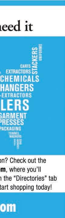 38 JUNE 2014 | AMERICAN LAUNDRY NEWS www.AmericanLaundryNews.com Source Directory listings in American Laundry News are sold on an annual basis at the following rates: All Major Credit Cards Accepted 2014 Listings Regular Boldface All Caps All Caps, Boldface Four Line Listing per Year $820 $1,030 $1,030 $1,090 Display and additional line rates available upon request FINANCIAL SERVICES Source Directory A convenient guide to sources of products and services FLATWORK IRONERS FLATWORK IRONERS PARTS Knowhow In Action Your Tingue rep is a fully trained master of finishing equipment operation, maintenance and installation. Call for: • Pads, covers, belts, waxes, tapes and more • Carts, trucks, baskets and bags • Parts, rebuilds and repairs 800.829.3864 www.Tingue.com TalleyMachinery.com MODLaundry.com TBR-Associates.com To website (480) 205-1293 (602) 763-7416 www.azsle.com Whether your ironer needs pads and covers, wax cloths or cleaning supplies, or needs to be completely rebuilt, there is no job too big or too small for Southwest Laundry Equipment • Financing of all OPL, industrial and related equipment • Competitive rates • Flexible terms • No prepayment penalty 1-800-851-1001 ext. 209 | laundry@firestonefinancial.com www.firestonefinancial.com EQUIPMENT FINANCING COMMERCIAL & INDUSTRIAL FINANCING Place your ad ONLINE!