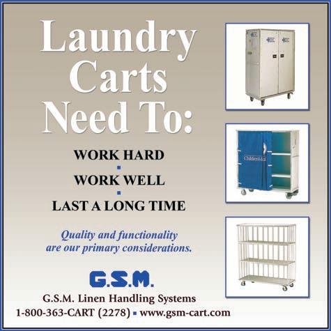 HEAT SEALING SUPPLIES/TAPE FLATWORK SUPPORT www.olekbelts.com 1-800-869-2683 Free www.olekbelts.com We’re your flatwork finishing and conveying O.E.M. Belt Match H.Q. Get the real thing for a Lot less $$$. O.E.M. Needlefelt Ironer Pads too! Better Belts, Better Prices, Better Service Visit our Website or Call 1-800-869-2683 For free, no obligation, price quotations and for your Free copy of our Product Catalog with over 40 samples. Ironer pads, covers, aprons, guide tapes, carts, slings, cleaners, waxes & more… Setting the Standard in Lint Filters for 25 Years • Hotel • OPL • Coin Op • Dry Cleaners • Industrial • Commercial • Cruise Industry Dry or Wet Style Filters to Work with “ALL” Dryer Sizes or Multiple Situations, Fiberglass or Stainless and Custom for Unique Situations! All manufacturing done on premise 800-826-1245 www.cleancyclesystems.com • ccsystems@tqind.com LINT COLLECTORS & FILTERS ★ Our In-Line Lint Filter mounts inside, saves space! ★ Fiberglass Wet Filters - 6,000 to 40,000 cfm ★ Fiberglass or Stainless Steel Dry Filters ENERGENICS CORPORATION Talk with our Design and Engineering Staff about your needs. Hundreds Sold Annually. 800-944-1711 www.energenics.com Get the info you need online... www.AmericanLaundryNews.com