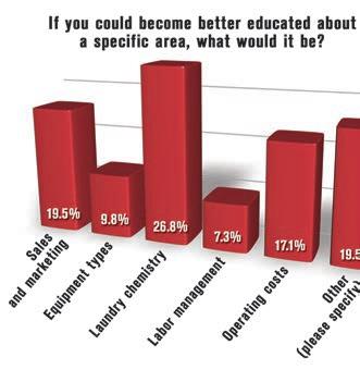 Laundry chemistry (chosen by 26.8%) is the leading area of which respondents believe they need to learn more. Sales and marketing education came in at 19.5%, while 17.1% of respondents want to learn more about operating costs.