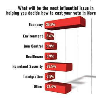 Those who took the survey pointed to several issues that would be “most influential” in helping them to decide how they would vote in November. The top issues: the economy (36.5%) and homeland security (23.5%). Further down the list were gun control and healthcare at 5.9% each, followed by immigration (3.5%) and the environment (2.4%).