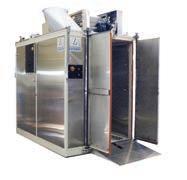 A software-controlled sling system feeds automated washers from overhead; garments are transferred from washers to the dryers and to other processing spaces by preprogrammed controls; the newest versions of tunnel finish-