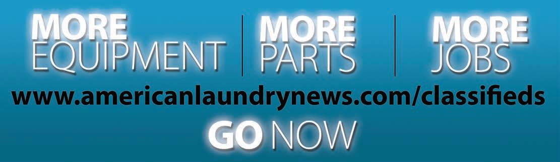 EQUIPMENT FOR SALE 2021 CLASSIFIED RATES: One- to fivetime rate: $2.80 per word, boldface $2.85 per word. Minimum charge: $25.00 per ad. Call or write for our six- and 12-time rates. If box number is used, add cost of five (5) words. Display classified rates are available on request. All major credit cards are accepted. DEADLINE: Ads must be received by the 1st of the preceding month. For example, for a June ad, the closing date is May 1st. PAYMENT FOR CLASSIFIED ADS: Must accompany order. DISTRIBUTOR OFFERINGS DESCRIPTION FOR NEW OR USED LAUNDRY EQUIPMENT, DM IS YOUR SOURCE FOR ALL YOUR NEEDS Chicago GL 24 Steam Ironer Continental 90lb Soft Mt Steam Washer Unimac 60lb Steam Washer Unimac UWN – 2010 60lb Washer Electrolux Gas Ironer 19” Primary Folder Tristar 28 w/ Stacker & OPL Feeder Reconditioned Air Chicago – Reconditioned 2010 Excellent Unipress CDB & Sleever Wascomat – 135lb EXSM 6135CL Washex FLS600 – 135lb Soft Mount Washer, New Bearing Reconditioned Milnor 250 Tunnel 72072 – 500lb System Dryers (2) Sharper 100” Steam Ironer 12” Roll Reconditioned ADC 236 Stack Dryers 30lb (10) Reconditioned Chicago Skyline Single Lane w/Stacker For Pricing call Ron Hirsch 516.938.4300 • 516.315.7426 Hicksville, NY • www.directmachinery.com DISTRIBUTOR OFFERINGS EQUIPMENT FOR SALE READY TO SHIP SELF CONTAINED OIL H IRONER 20” DIA 130” W WWW.JBILAUNDRYFOLDER.COM AMKO AMERICA INC. Sale on Hi Temp Wax Remanufactured Finishing Equipment AmkoAmerica@gmail.com 561-863-9696 TEXTILES WANTED WANTED • Work Garments F/R or Regular D/C or Cotton • New and Used Coveralls, Jeans and Bibs • Rags: Terry Cloth, Dish Towels, Glass Towels, Hospital Flannel Blankets, Bath Towels, etc. We buy by the pound. We set up the freight. Please call RagMan toll free 877-572-4626 VISIT www.AmericanLaundryNews.com Stanco Industries, Inc. Serving The Textile Trades Since 1970 800-932-3769 k for Mike or Deb KEEPING IT GREEN SINCE 1970 WE ARE LOOKING FOR THE FOLLOWING EQUIPMENT: WASHING • DRYING • FOLDING FEEDING • IRONING • FINISHING MATERIAL HANDLING • BOILERS CONTINUOUS BATCH WASHING STACKERS • CART DUMPERS Please visit our updated website: www.stancoind.com E-mail: buyer@stancoind.com TO PLACE YOUR AD CALL DON FEINSTEIN 312-361-1682 American LaundryNews .com More than unique visitors monthly! 5,250 VISIT www.AmericanLaundryNews.com www.AmericanLaundryNews.com