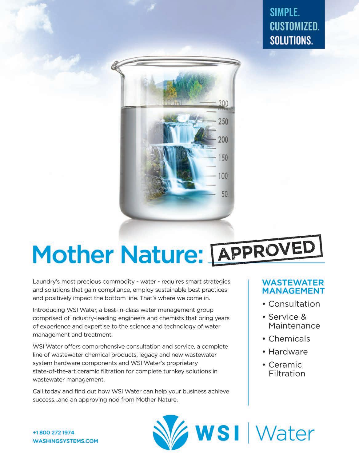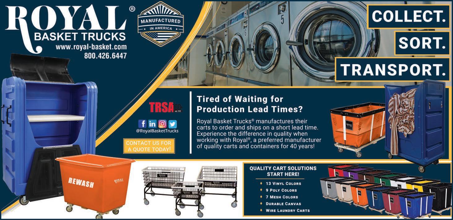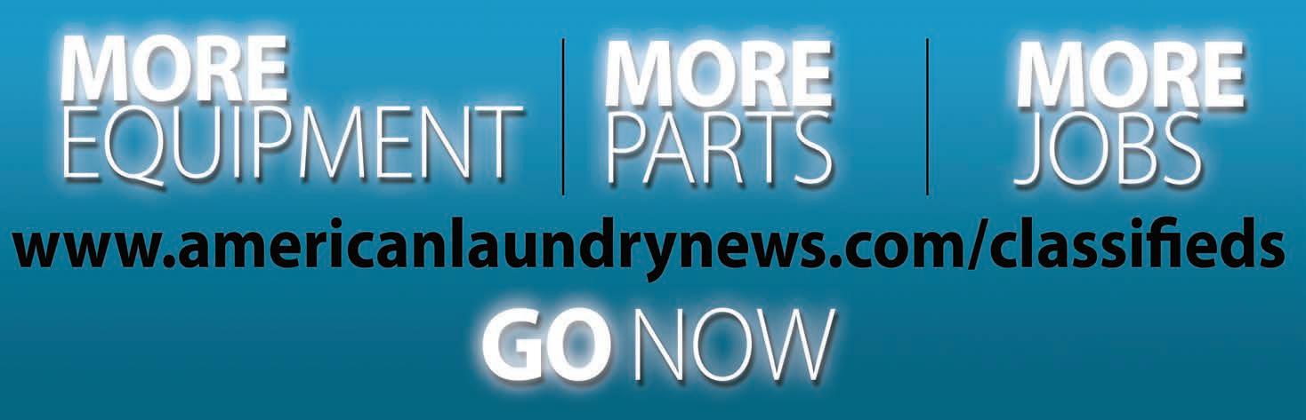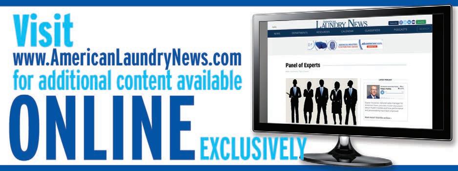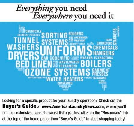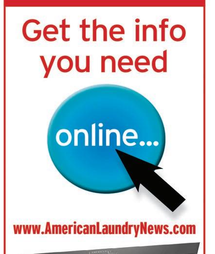 without written permission from the publisher or his representative. American Laundry News does not endorse, recommend or guarantee any article, product, service or information found within. Opinions expressed are those of the writers and do not necessarily reflect the views of American Laundry News or its staff. While precautions have been taken to ensure the accuracy of the magazine’s contents at time of publication, neither the editors, publishers nor its agents can accept responsibility for damages or injury which may arise therefrom.