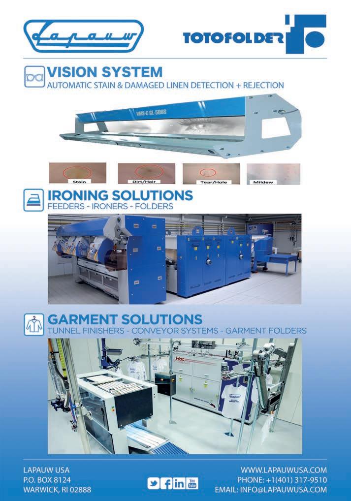 Related to technology investments, this issue has two laundry operation case studies. Both Brightwater Laundry (14) and JVK Operations (16) have made recent equipment purchases and upgrades with some impressive results. The issue also offers Tools of the Trade (page 8) and industry news (page 23), all to help everybody keep it clean.