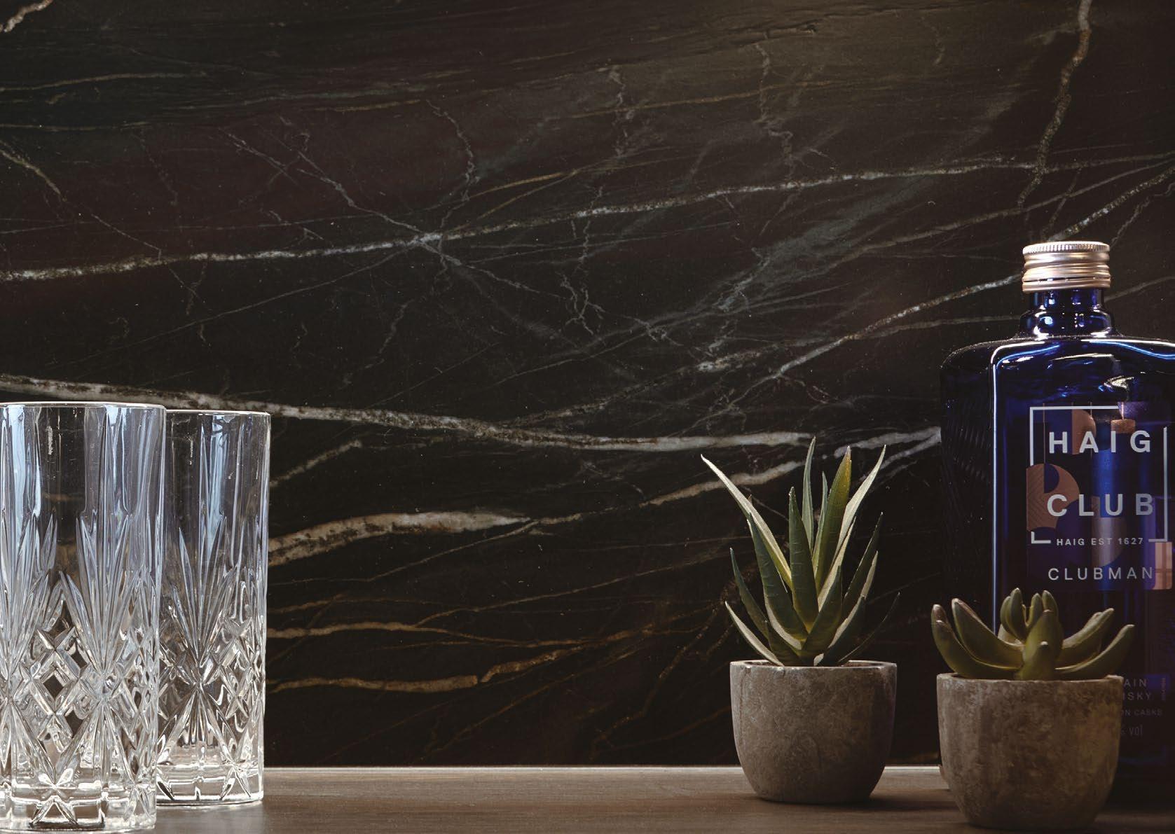 • A one-of-a-kind mitred marble bar, specially sourced in a flamed and honed finish to prevent projector glare