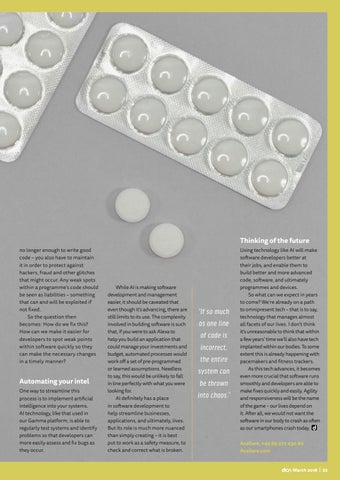 Using technology like AI will make software developers better at their jobs, and enable them to build better and more advanced code, software, and ultimately programmes and devices. So what can we expect in years to come? We’re already on a path to omnipresent tech – that is to say, technology that manages almost all facets of our lives. I don’t think it’s unreasonable to think that within a few years’ time we’ll also have tech implanted within our bodies. To some extent this is already happening with pacemakers and fitness trackers. As this tech advances, it becomes even more crucial that software runs smoothly and developers are able to make fixes quickly and easily. Agility and responsiveness will be the name of the game – our lives depend on it. After all, we would not want the software in our body to crash as often as our smartphones crash today. Acellere, +49 69 272 430 80 Acellere.com March 2018 | 33