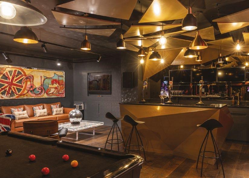 Dominic reveals, “The main area of the room is used as a home cinema, with highperformance AV using a Sony projector and Procella speakers. We also used Rako lighting for creating scenes and controlling the blinds and curtains. Fabric lining was employed throughout most of the room. There are two rows of FrontRow leather cinema chairs, built onto a custom platform of our own construction, which also houses a secondary TV serving the back of the room (bar/games area). This platform also acts as a baffle wall, with diffusion diverting audio back to the seated position for some clever audio management.”