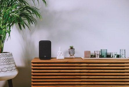 edges and refined material finishes that complement modern interiors. Available in Black Charcoal, White Pebble Grey, and White Tan, the speaker can adapt to a wide range of home styles. Optional accessories include the WM100 Wall Mount, FS230 Adjustable Stand, and interchangeable fabric grilles in tonal weaves, offering personalisation in both placement and aesthetics.