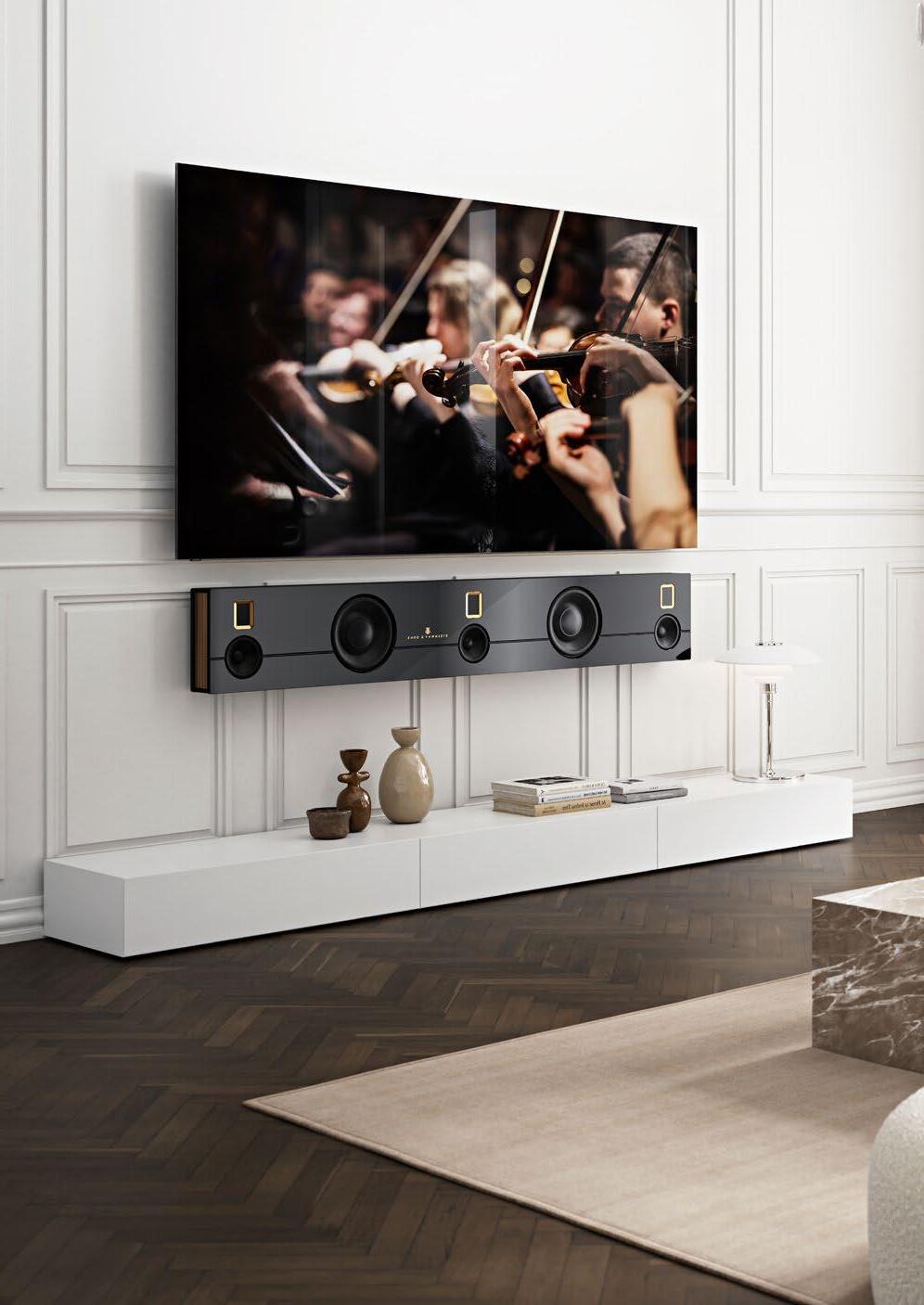The black front is complemented by signature gold-plated tweeter frames and bronze-gold lacquered sides with black strings. Every Model S Soundbar is assembled and finished by hand in Skive, Denmark, made to the same quality standards as a Steinway & Sons piano. Customised lacquers and finishes are available on request.
