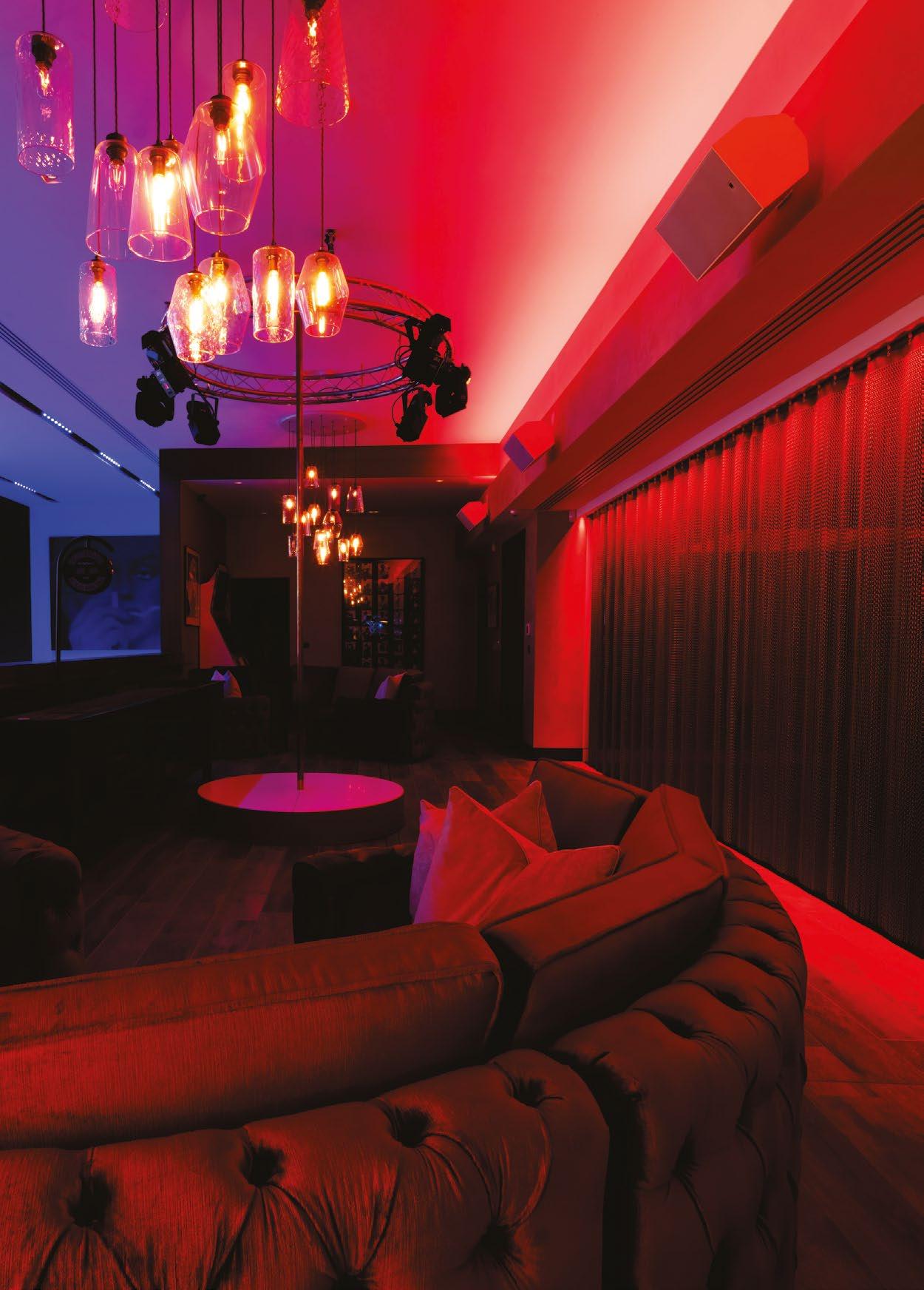 the exposed ceiling. To preserve the interior design, the speakers were fixed to existing cable trays, allowing them to blend into the blackpainted ceiling. Black-finished speakers were chosen to match the contemporary aesthetic.