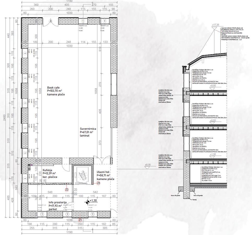 Mint Sarajevo represents a dynamic space for exploration, learning, and collaboration, symbolizing innovation and knowledge Embracing the imperative of sustainability, the Tourist info center prioritizes eco-friendly practices and energy-efficient design It stands as a beacon of environmental consciousness, embracing forward-thinking initiatives that minimize its ecological footprint and exemplify responsible stewardship of our shared planet The form of the object was designed by analyzing doxat which represents the protruding part of the house and it’s similar to a closed balcony. The construction is quite simple. It onsists of fiber cement board, which rests on a OSB board which further rests on wooden supports, i e beams, whose mutual distance is 90 cm The load from the roof is further transferred to the wooden ones floor beams 15x15cm The interior lining is made of wood boards, their dimensions vary. The entire construction is placed on steel "i" profiles and these profiles raise the modulus and protect against unwanted influences. Steel profiles are supported on 10x10cm bases.