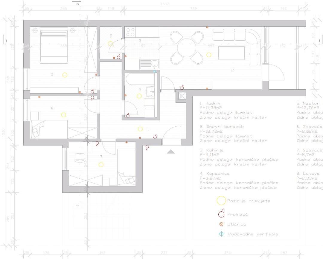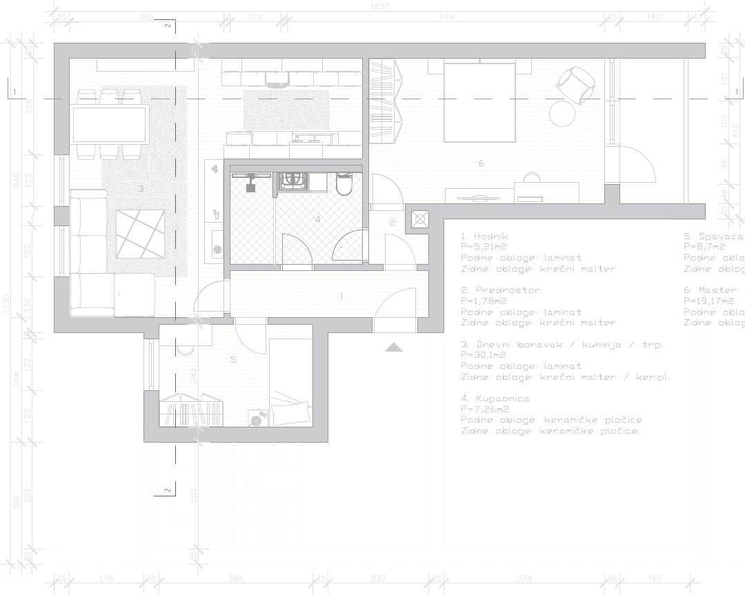 The building where the apartment is located is situated in Novi Travnik It has four floors and was built in the eighties of the last century The apartment is located on the third floor It has a good orientation and has a good quality for adaptation. All the necessary facilities are within a radius of 100 meters The goal of this task was to create a space that would suit all the household members A couple of variants were made through sketches and the one considered the most favorable was adopted Part of the hallway was removed, and in this way a larger bathroom was obtained. The main adaptation was made by combining the kitchen with the dining room and the living room, and this was achieved by removing two bedrooms, as well as the pantry. The existing installations are retained. Instead of the former living room, there is a master bedroom The children's room is separated by the hallway, thus providing privacy. This adaptation enabled a better orientation of the rooms as well as b tt lki th Sketch variants