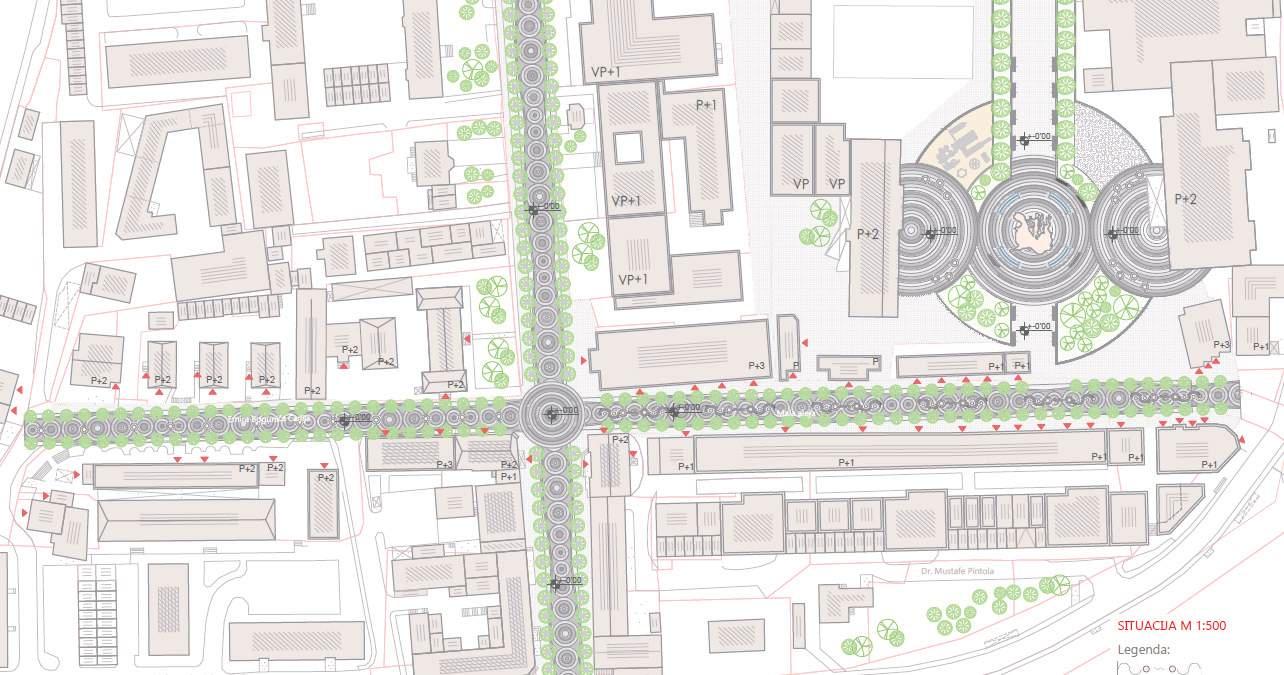 The transformation of Mala aleja and Emira Bogunića Čarlija streets was necessary along with their merger, as well as designing a gathering square Before the design process, many analyzes were done including: urban morphology, urban matrix, spatial-functional schemes, traffic analysis, ecological values of the localitycategorization (microclimate), reclamationreal and material values of buildingscategorization, demolition map, openness / closure of space, (dis)continuity of space, public - private relation, materialization, design characteristics, relations between objects, relations between objects and open spaces, historical context of the genesis of the observed spatial scope, as well as a synthesis map.