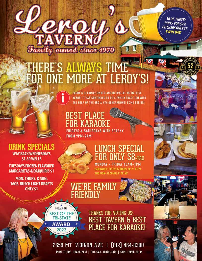 For more info, follow Leroy's Tavern on Facebook. Leroy's is located at 2659 Mt. Vernon Ave. in Evansville.