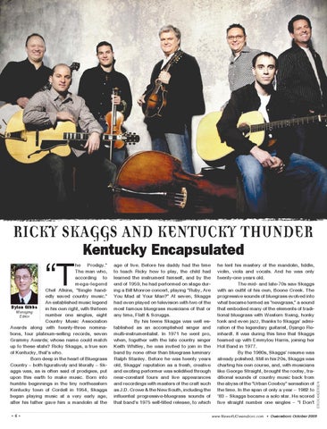 he Prodigy.” The man who, according to mega-legend Chet Atkins, “Single handedly saved country music.” An established music legend Dylan Gibbs in his own right, with thirteen Managing number one singles, eight Editor Country Music Association Awards along with twenty-three nominations, four platinum-selling records, seven Grammy Awards; whose name could match up to these stats? Ricky Skaggs, a true son of Kentucky, that’s who. Born deep in the heart of Bluegrass Country – both figuratively and literally – Skaggs was, as is often said of prodigies, put upon this earth to make music. Born into humble beginnings in the tiny northeastern Kentucky town of Cordell in 1954, Skaggs began playing music at a very early age, after his father gave him a mandolin at the •6•