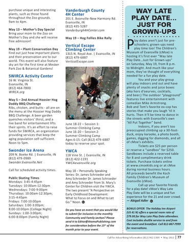 lay dates aren’t just for preschoolers; grown-ups need play time too! The Children’s Museum of Evansville (cMoe) is hosting it’s first ever “Way late Play Date…Just for Grown-ups” on Saturday, May 19, from 8 p.m. to Midnight. And much like your mom, they’ve thought of everything needed for a fun play date. You and your play group will play indoors and out and have plenty of snacks and juice boxes (aka hors d’oeurves, cocktails, and beer.) The outdoor “playground” features live entertainment with comedian Mike Armstrong. Bob and Tom’s favorite ex-cop has stories that make you laugh ‘til it hurts. Then it’ll be time to dance in the streets with Evansville’s own “All Put Together” band. Indoors, if you aren’t too preoccupied climbing up a 30-footduck, enjoy karaoke, a photo booth, games, digging for diamonds, and all of cMoe’s exhibits. Tickets are $25 per person or reserve a “sandbox” for $250. Sandboxes include a reserved table for 8 and complimentary drink tickets. Purchase tickets online at www.cmoekids.org or at cMoe during normal business hours. All proceeds benefit the Koch Family Children’s Museum of Evansville (cMoe). Call up your favorite friends for a play date! cMoe’s Way Late Play Date will be a unique and fun experience for the 21 and over crowd. — Abigail Adler