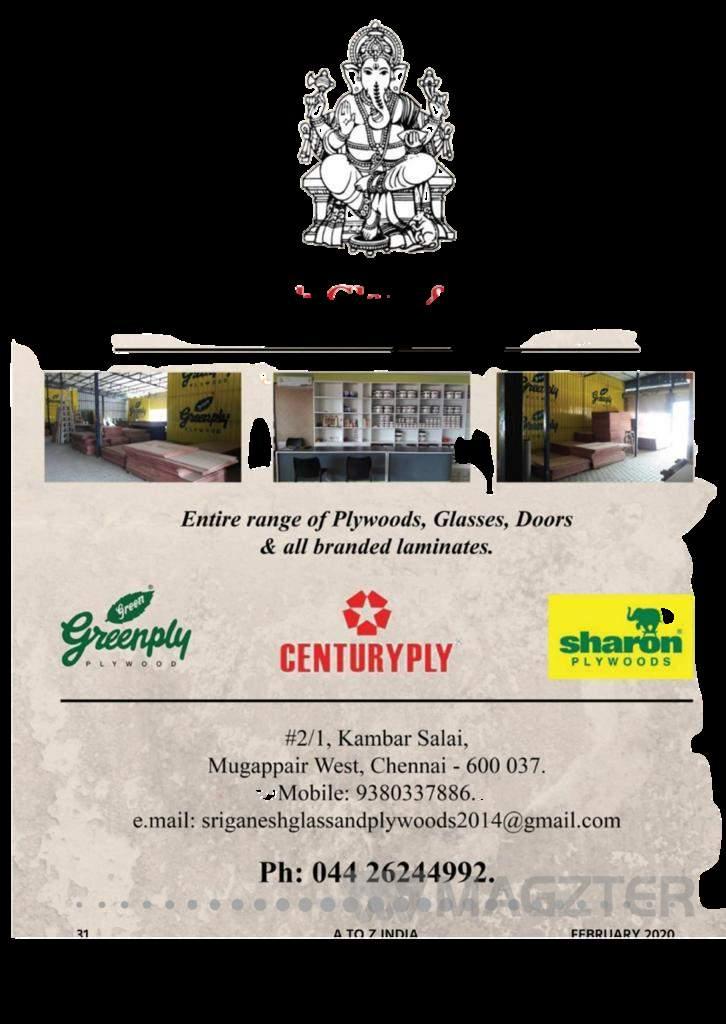 Sri Ganesh Glass & Plywoods Entire range of Plywoods, Glasses, Doors & all branded laminates. #2/1, Kambar Salai, Mugappair West, Chennai - 600 037. Mobile: 9380337886, 9566118008 e.mail: sriganeshglassandplywoods2014@gmail.com Ph: 044 26244992.