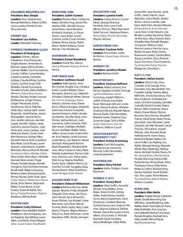 Columbia-Brazoria (67) President: Bess Simple Leaders: Amy Stephenson, Brenda Matthews, Debra Griffin, Laura Lackey, Pamela Erwin, Terry German Crosby (66) President: Lisa Kallies Leader: Meredith Hackney Cypress-Fairbanks (2,236) President: Eli Rodriguez Leaders: Al Brien, Allison Cheatham, Amy Piotrowski, Angela Bowen, Anne Marsh, Barbara Lopez, Blanca Nunez, Carmen Walker, Carol Scursatone, Carolyn Coffelt, Carrie Hendrix, Cazzie Escalante, Charlotte Godsey, Claudia White, Cynthia Lorenz, Cynthia Surgi, Dale Maddox, Daniel Scursatone, Daniella Schultz, Debra RobbinsWilliams, Debra Vela, Donna Woods, Dorothy Hulett, Frances McMenamy, Ginger Picone, Ginger Thevenote, Gloria Hawthorne, Glynis Fletcher, Holly Hays, Jackye Spell, James Bosworth, Janet Kramer, Janice McSpadden, Jeanne McGuckin, Jenifer Johnson, Jennifer Lappe, Jennifer Soileau, Jesse Guerrero, Jessica Flowers, Judy Hitchcock, Julian Godsey, Julie Medrano, Karen Comer, Kathleen Moreman, Kathye Allen, Kenneth Garcia, Kristi Crawford, Kyla Mote, Laura Bissey, Laurie Spence, Linda Moore, Lisabeth Belinoski, Marcus McGriff, Maribel Contreras-Helton, Marilyn Ocker, Mary Smith, Mary Wynn, Michelle Manuel, Nola Jensen, Paige Phares, Pamela Spivey, Pamela Tompkins, Patricia Fisher-Holmes, Randi Gloff, Rebecca Kassing, Rebecca Keels, Rhonda Esterak, Roman Nunez, Ruth Scott, Sean Ocker, Sharon Halliburton, Sherie Doyle, Shira Sherer, Stephanie Bailey, Susan Byrne, Susan Guidry, Suzanne Bathe, Tara Burns, Tracey Dennison, Virginia Bradbury, Wendy Brien Dayton (289) President: Cathy Harbour Leaders: Alma Waddell, Daleah Middleton, Donna Kopecky, Janice Kopecky, Kay Wallace, Laura Allen, Lisa Revils, Sheryl Wagenseller, Susan Oubre, Tara Brandt