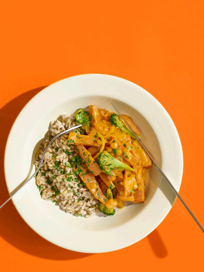 Stroganoff: Värm en vid kastrull med olja till medelhög temperatur. Fräs löken och morötterna ett par minuter. Tillsätt tomatpurén och fräs vidare i 2 minuter. Tillsätt sedan vinägern, grädden, vattnet och linserna. Koka i ca 15 minuter, tills linserna är mjuka. Värm under tiden upp en stekpanna med olja till medelhög temperatur. Stek korven några minuter till en lätt brynt färg. Tillsätt korven och broccolin i grytan och låt koka i ca 3 minuter. Späd med vatten om det behövs. Smaka av med salt och svartpeppar. Toppa grytan med persilja och servera den tillsammans med havreriset.