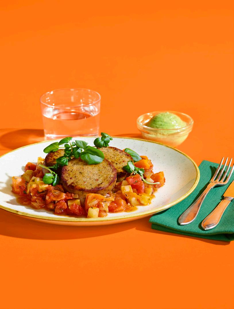 Ratatouille: Fräs rotsaker, lök och vitlök i olivolja i en vid kastrull några minuter. Häll på vinägern och tomaterna. Låt ratatouillen puttra ca 15 minuter och smaka av med salt och tabasco.