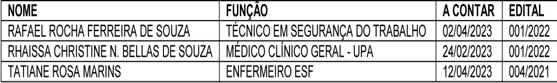 A Secretaria Municipal de Administração, no uso de suas atribuições legais, torna público a PRORROGAÇÃO dos convocados da Secretaria Municipal de Saúde, nos termos dos respectivos editais indicados, dos seguintes profissionais, conforme abaixo discriminado: