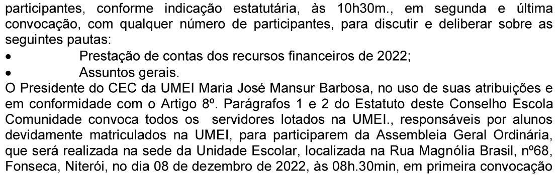 Presidente Executivo em exercício do Clube Português de Niterói, no uso de suas atribuições estatutárias, e em conformidade com o inciso (d) do artigo 49 parágrafo 2º do Estatuto Social vem: