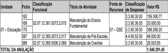 das anulações de saldos orçamentários conforme autoriza o artigo 43 parágrafo 1º - inciso III da Lei Federal nº 4.320/64 das dotações orçamentárias relacionadas a seguir: