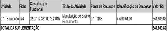 DECRETA: Art. 1º - Fica aberto pelo Poder Executivo, o Crédito Adicional Suplementar, no valor de R$ 641.609,82 (Seiscentos e Quarenta e Um Mil, Seiscentos e Nove Reais e Oitenta e Dois Centavos) para atender despesas da Secretaria Municipal de Educação, de acordo com a dotação orçamentária relacionada no quadro a seguir: