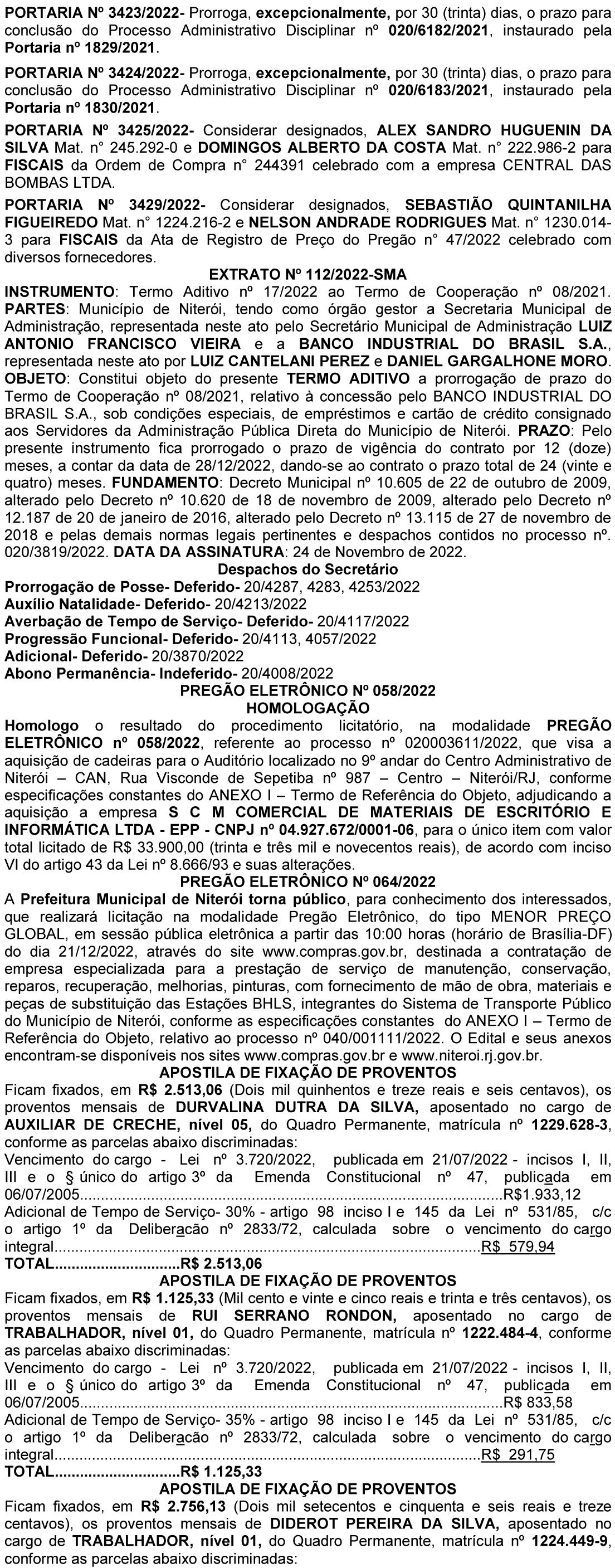 O Secretário Municipal de Administração da Prefeitura Municipal de Rio Bonito, Estado do Rio de Janeiro, no uso de suas atribuições legais e tendo em vista o que consta no Processo n.º 6525 de 17.11.2022, RESOLVE, averbar ao tempo de serviço da Servidora Municipal CARINE DE CASTRO GOMES, Matrícula nº. 4185, no cargo de AGENTE COMUNITÁRIO DE SAÚDE, 545 (quinhentos e quarenta e cinco) dias, o equivalente à 01 (um) ano 06 (seis) meses constante na Certidão de Tempo de Contribuição do INSS- Instituto Nacional do Seguro Social Protocolo 11033050.1.00286/ 22-0, com fulcro no Art. 76, Inc IV da Lei 1822/2013 combinado com a Art. 201, § 9º da Constituição Federal. Registre-se e Publique-se, Prefeitura Municipal de Rio Bonito, em 01 de Dezembro de 2022.