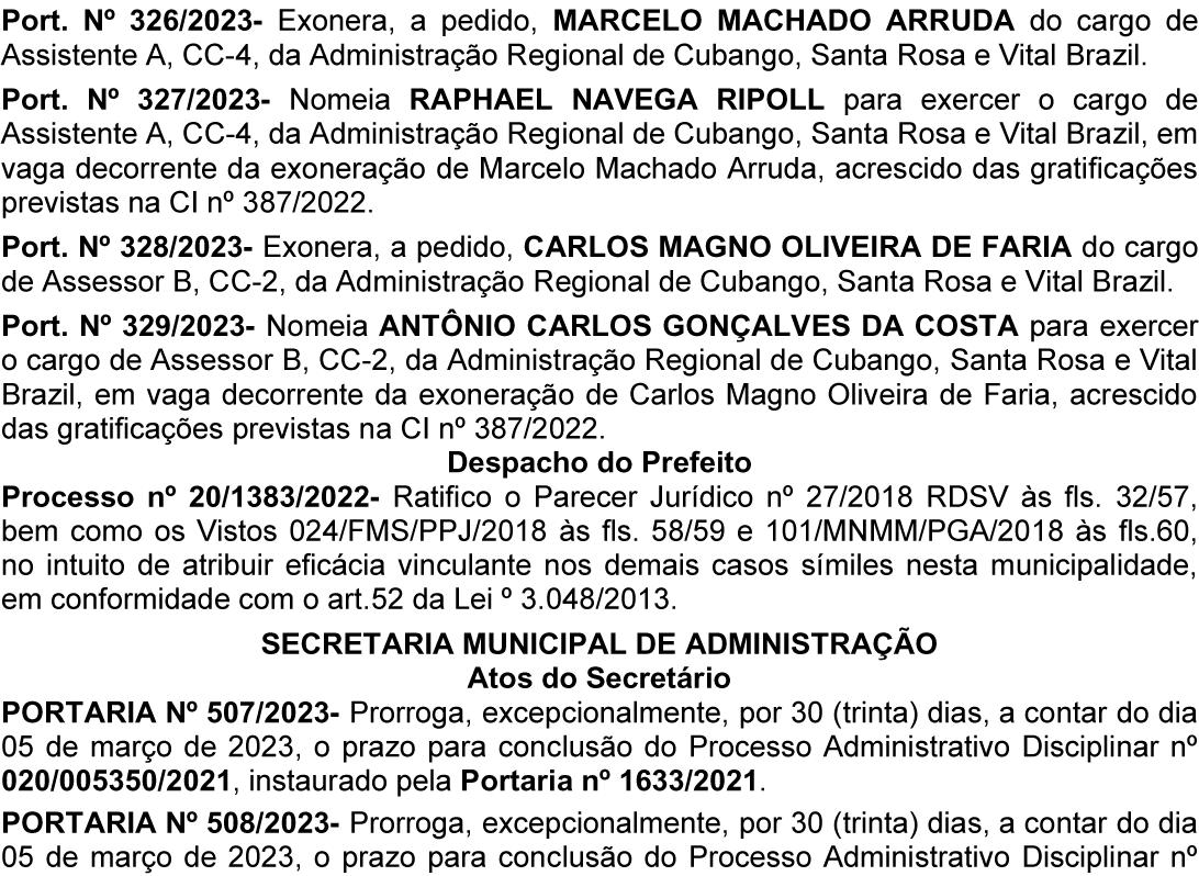 Processo nº 563/2023, Servidor(a) SANDRA CHAVES IGNACIO, inscrito(a) no CPF: 829.735.637-04, matrícula 4082 no no cargo de PROFESSOR ORIENTADOR PEDAGÓGICO, carga horária 20H semanais (Prefeitura Municipal de Rio Bonito), e matricula 023828-1, no cargo de PROFESSOR I com carga horária 30H semanais (Secretaria de Estado de Educação). Lícita a acumulação de cargos pelo servidor (a) nos termos do art. 37, XVI, a, da Constituição Federal; Rio Bonito, 03 de Março de 2023. Bernardo Guimarães Secretario Municipal De Administração (Interino) Mat: 8960975