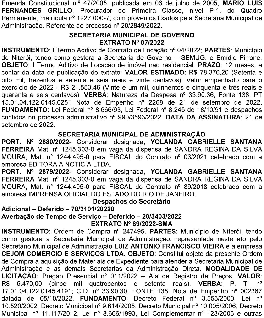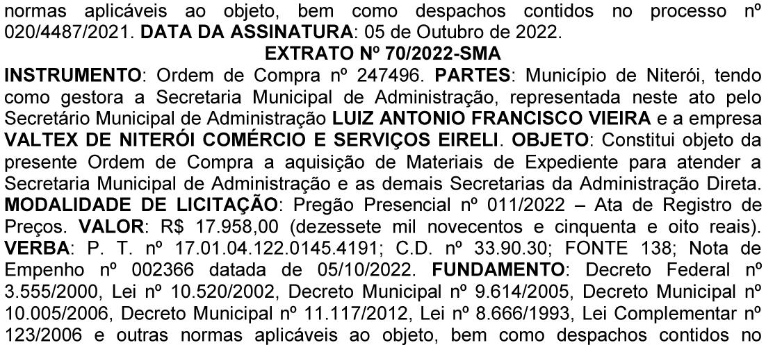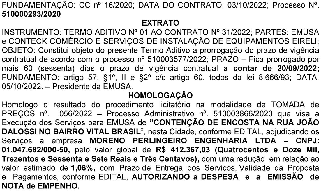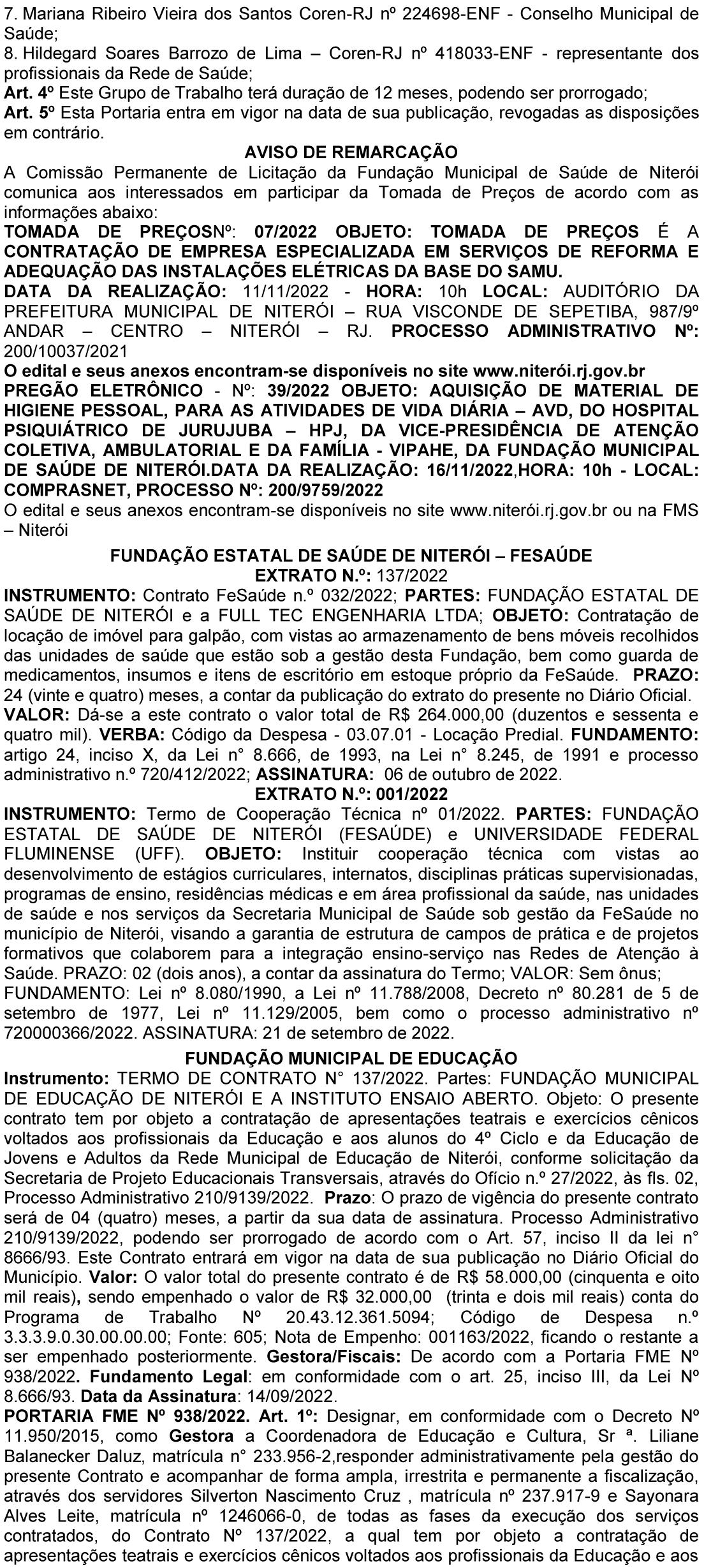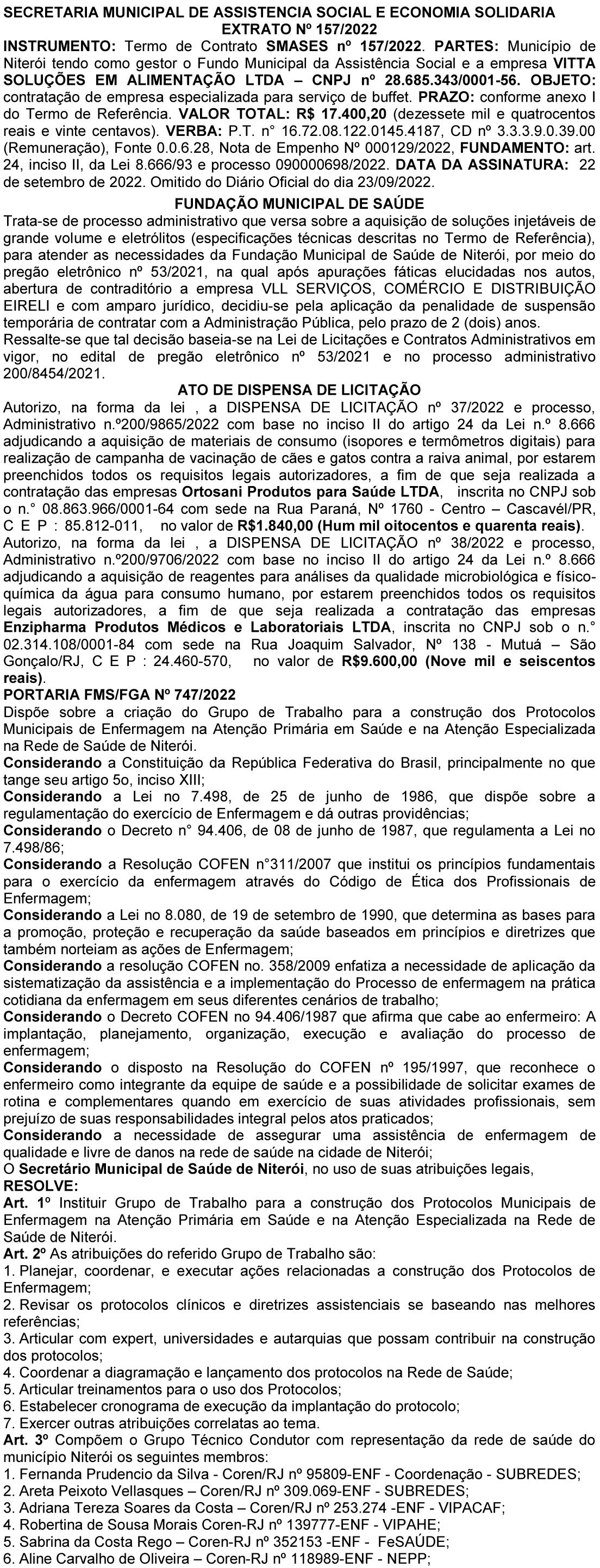 MUNICÍPIO DE RIO BONITO E INVISTA BUSINESS DISTRIBUIDORA, SERVIÇOS E LOCAÇÕES LTDA. Aquisição de Tela de Proteção para caixa d‘àgua. R$ 21.900,00 (Vinte e um mil, novecentos reais) Processo n° 2842/2022. Contrato SECSA nº 153/2022. O presente contrato terá vigência de 60 (sessenta) dias. Data da assinatura: 05/10/2022.