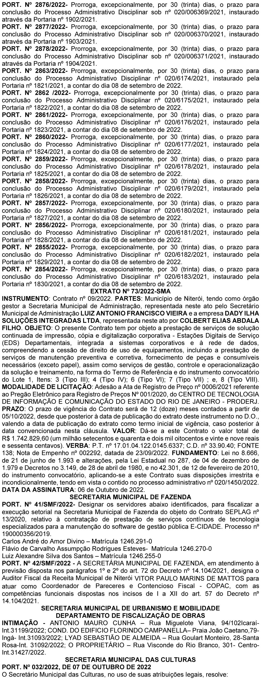 Art. 1º Ficam novamente prorrogados até o dia 14 de outubro de 2022, os vencimentos referentes aos pagamentos dos tributos municipais vincendos a partir do dia 12 de setembro de 2022 ou aqueles que dependam de prévia aprovação pela Divisão de Fiscalização de Tributos (ex: ISSQN EVENTUAL ou FIXO, ITBI, AUTOS DE INFRAÇÂO), apurados mais ainda não lançados.