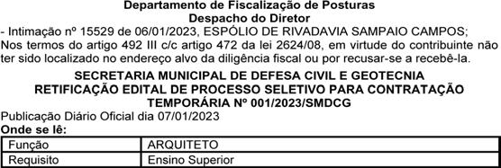 A Secretaria Municipal de Administração, no uso de suas atribuições legais, torna público a PRORROGAÇÃO dos convocados da Secretaria Municipal de Obras e Serviços Públicos, nos termos dos respectivos editais indicados, dos seguintes profissionais, conforme abaixo discriminado: