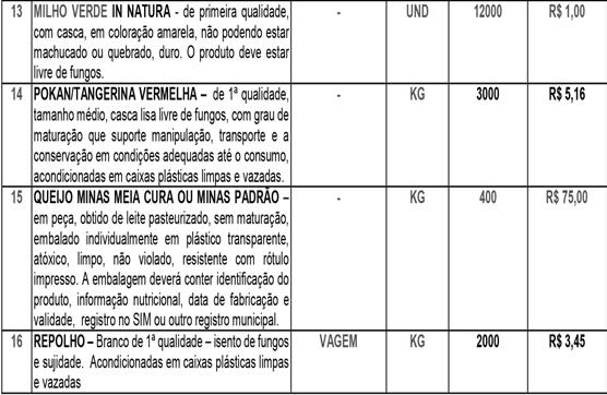 O objeto da presente Chamada Pública é a aquisição de alimentos da Agricultura Familiar no âmbito do Programa Alimenta Brasil na modalidade compra com doação simultânea para as Unidades Escolares, conforme especificações dos gêneros alimentícios abaixo: